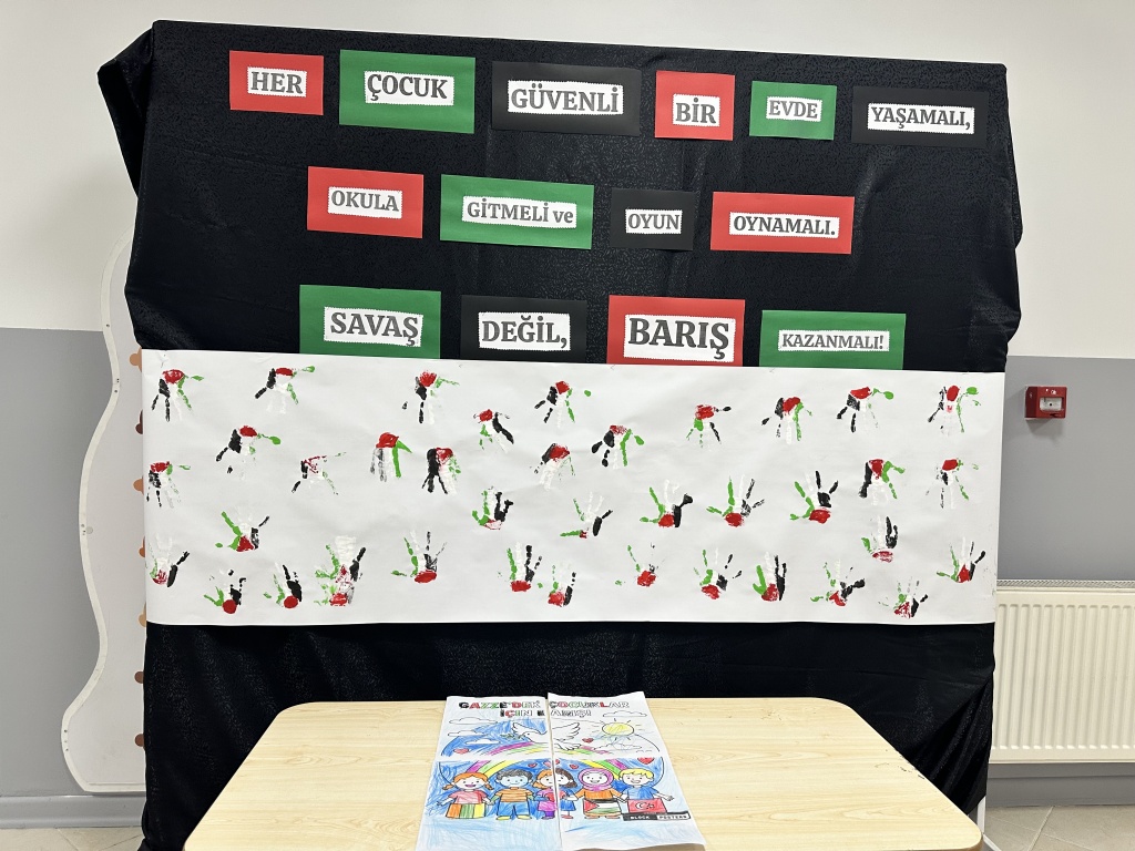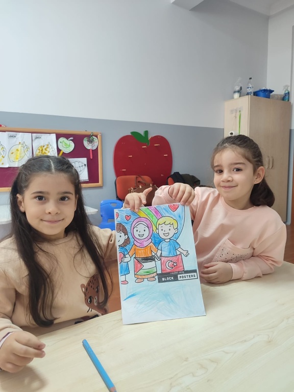 Okul öncesi öğrencilerimiz, barış ve kardeşlik temasıyla birçok etkinlik yaptı. Filistin’in renkleriyle boyamalar yaptılar, kendi küçük bayraklarını hazırladılar, barışı simgeleyen güvercinler süslediler.