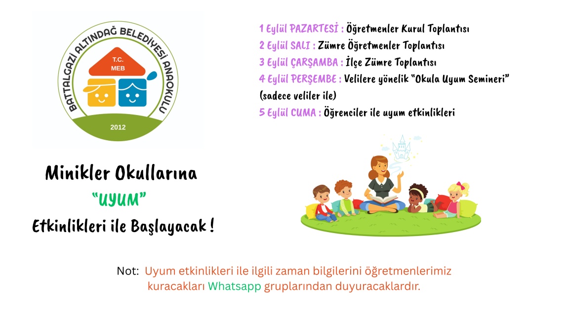 1-5 Eylül tarihleri arasında Uyum Haftası etkinlikleri gerçekleştirilecektir. Etkinlikler, Millî Eğitim Bakanlığı tarafından hazırlanan Okul Öncesi Uyum Programı doğrultusunda planlanacaktır.